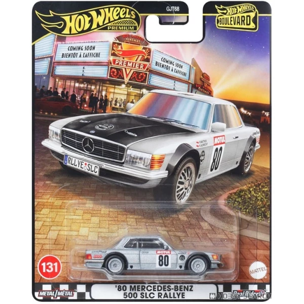 A Hot Wheels Premium Boulevard '80 Mercedes-Benz 500 SLC Rallye (ref. HRT63), faz parte da linha premium da marca, que se destaca pelo maior nível de detalhamento, acabamento em metal, pneus de borracha (Real Riders) e grafismo de alta qualidade.