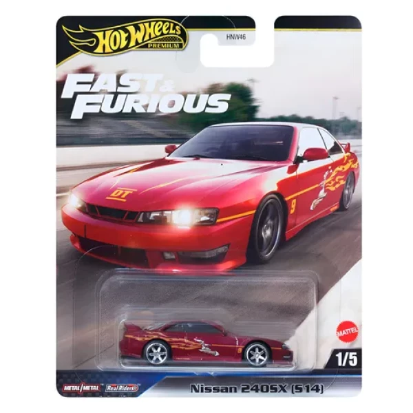 A Hot Wheels Premium Nissan 240SX (S14) - Fast & Furious é uma miniatura colecionável em escala 1:64, lançada em diversas cores e edições ao longo dos anos. Ela faz parte da linha premium da Hot Wheels dedicada aos veículos da saga de filmes Velozes e Furiosos, que conta com acabamentos mais detalhados e rodas de borracha (Real Riders).