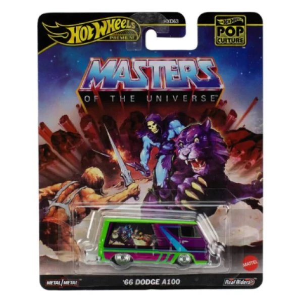Este modelo representa a clássica e robusta van 1966 Dodge A100 com uma pintura customizada que presta homenagem ao universo de He-Man. A carroceria é decorada com artes vibrantes, logotipos e possivelmente os principais personagens como He-Man, Esqueleto e o Castelo de Grayskull, transportando a fantasia épica do desenho animado para as ruas. A miniatura transforma um utilitário clássico em um veículo de transporte de heróis intergalácticos.