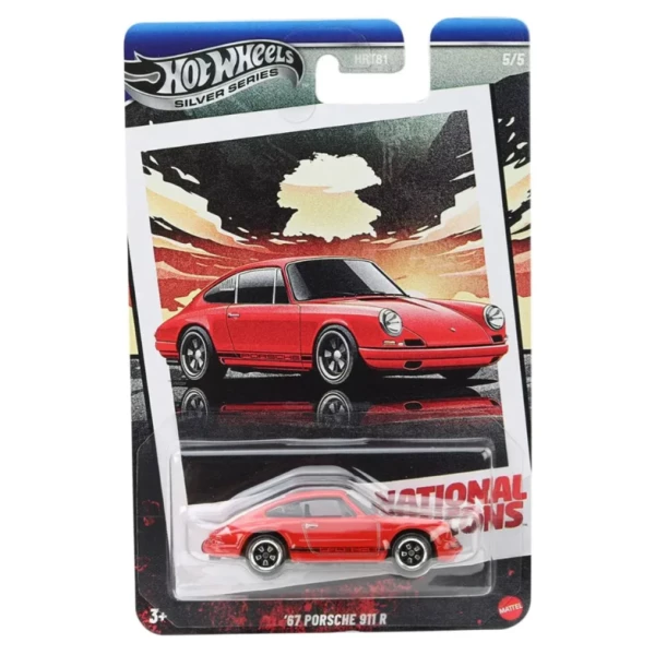 A miniatura possui corpo de metal die-cast e base de plástico. A versão padrão do '67 Porsche 911 R vem em uma vibrante cor vermelha, complementada por decorações (tampos) que incluem faróis e lanternas detalhados, listras de corrida e o logotipo "Porsche" nas laterais, conferindo um visual de "Rally Retrô".