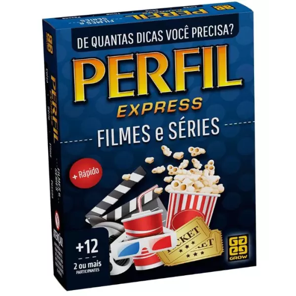 "Perfil Express Filmes e Series e a novidade de um dos maiores classicos da Grow. Ele traz uma nova forma de jogar atraves de categorias inspiradas no streaming e nas telas de cinema! Cada cartela possui 10 dicas que valem ate 10 pontos. A primeira dica e menos reveladora, e as seguintes, de maneira progressiva, aumentam mais as chances de acerto. Esta versao foi especialmente desenvolvida para ser jogada por duas pessoas ou equipes, sem a necessidade de um tabuleiro. Com um novo sistema de pontuacao, o vencedor sera aquele que fizer mais pontos durante cinco rodadas. Desafie alguem ou reuna a galera para aproveitar ao maximo o novo Perfil Express Filmes e Series!"