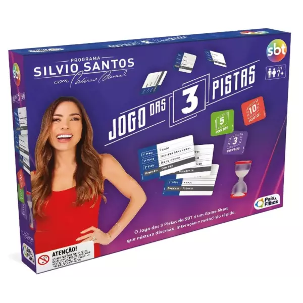 O Jogo das 3 Pistas é a versão oficial e licenciada do famoso game show exibido pelo SBT, apresentado por Patrícia Abravanel nas noites de domingo. Agora, você pode levar para casa toda a emoção e o desafio do programa de maior audiência do Silvio Santos, reunindo amigos e familiares em momentos de pura diversão!