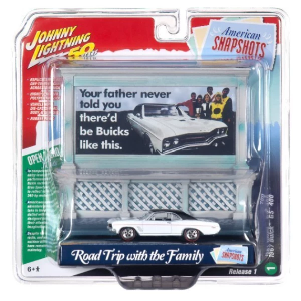 O grande diferencial deste item é seu diorama exclusivo, que recria um outdoor vintage com a propaganda da Buick da época, trazendo a frase: "Your father never told you there'd be Buicks like this" (Seu pai nunca te disse que existiriam Buicks como este). A cena evoca a sensação de uma viagem em família pelas estradas americanas, transformando a miniatura em uma verdadeira cápsula do tempo.