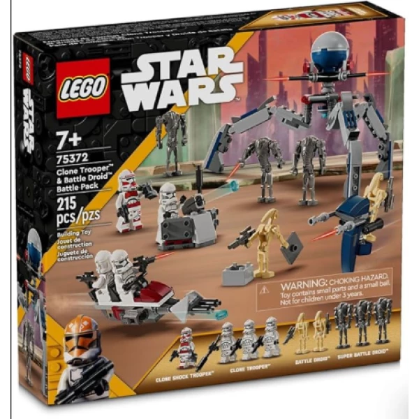 Ele contém 4 minifiguras LEGO Star Wars e 5 figuras LEGO: um Soldado Clone de Choque, 3 Soldados Clone, 3 Super Droides de Batalha e 2 Droides de Batalha com armas icônicas para brincadeiras de ação. Esse conjunto de construção LEGO também inclui uma motocicleta speeder disparadora de pinos de Star Wars para 2 Soldados Clone e um veículo construível speeder STAP para um Droide de Batalha.